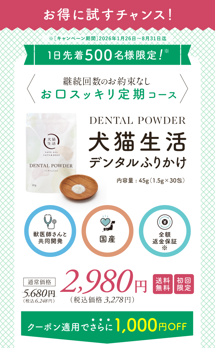 ※1 ※2025年5月31日までの犬猫生活ブランド累計販売食数(ドッグフードは1食45g換算(成犬4kgの1日の目安量。1日2食換算)、キャットフードは1食36g換算(成猫4kgの1日の目安量。1日2食換算)、手作りごはんは1食188g換算(成犬4kgの1日の目安量。1日2食換算)、サプリメントは1食1袋換算)※2 着色料、香料、保存料不使用 ※3 2021年9月1日~11月25日の期間で「デンタルふりかけ」の定期コースに申し込んでいる注文から算出。 ※今後、商品の外観、価格、仕様等を変更させていただく場合があります。予めご了承ください。