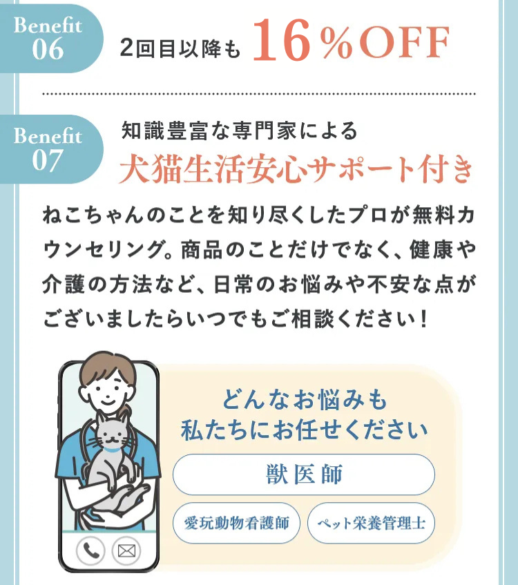 ※お得にお届け便は1回のみの受け取りでも停止・休止・解約が可能ですが、ねこちゃんの健康維持のためにできるだけ長くご継続をいただくことをお勧めしています。