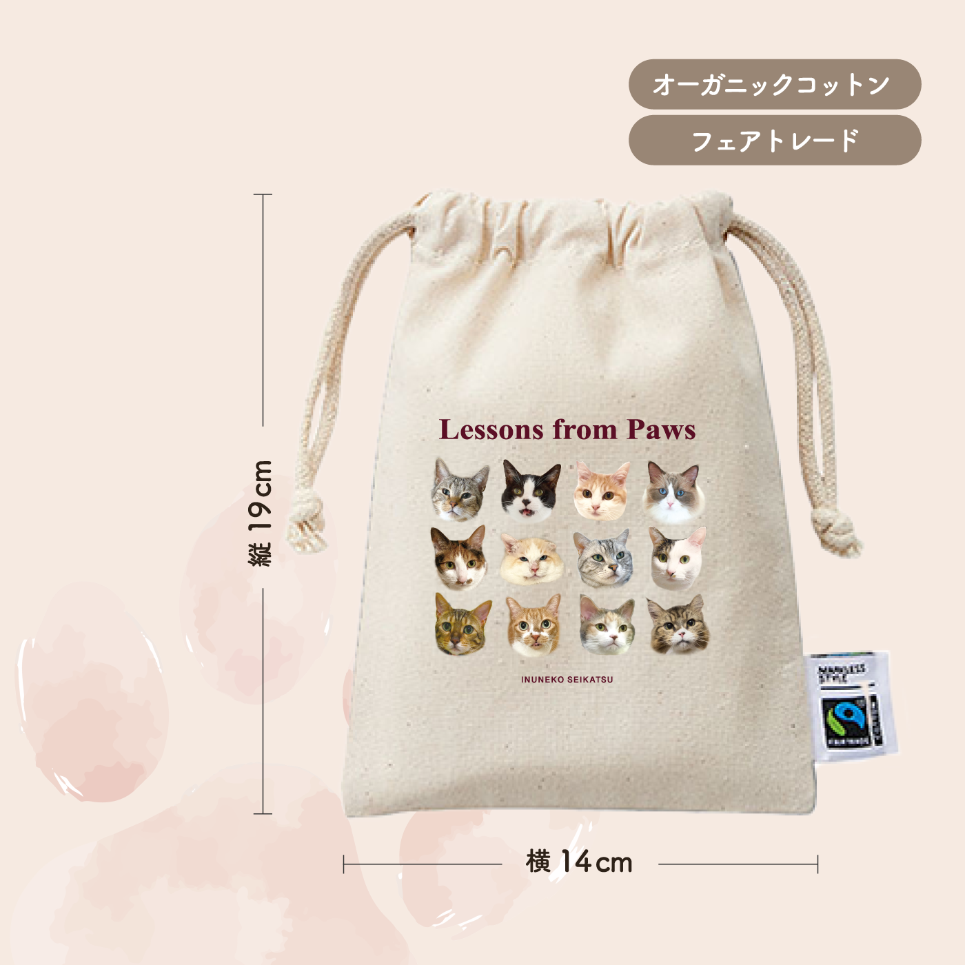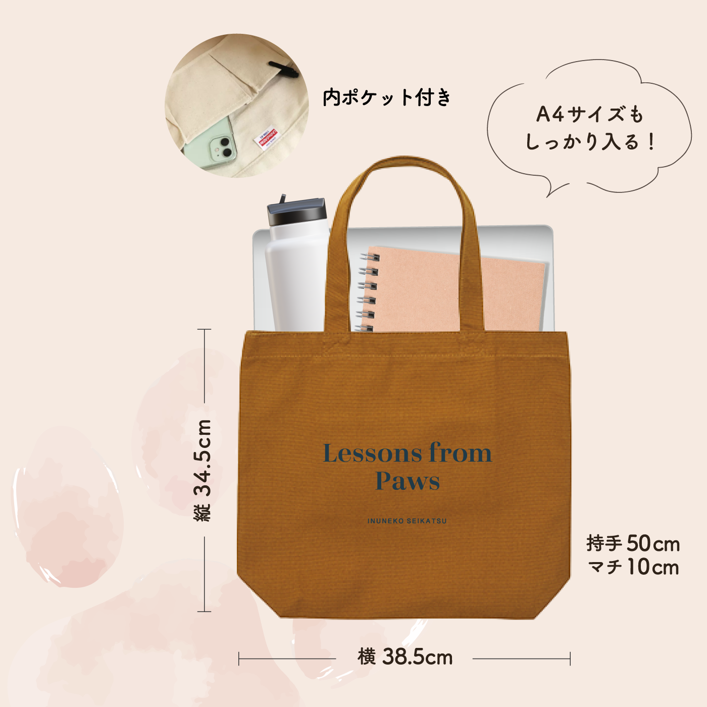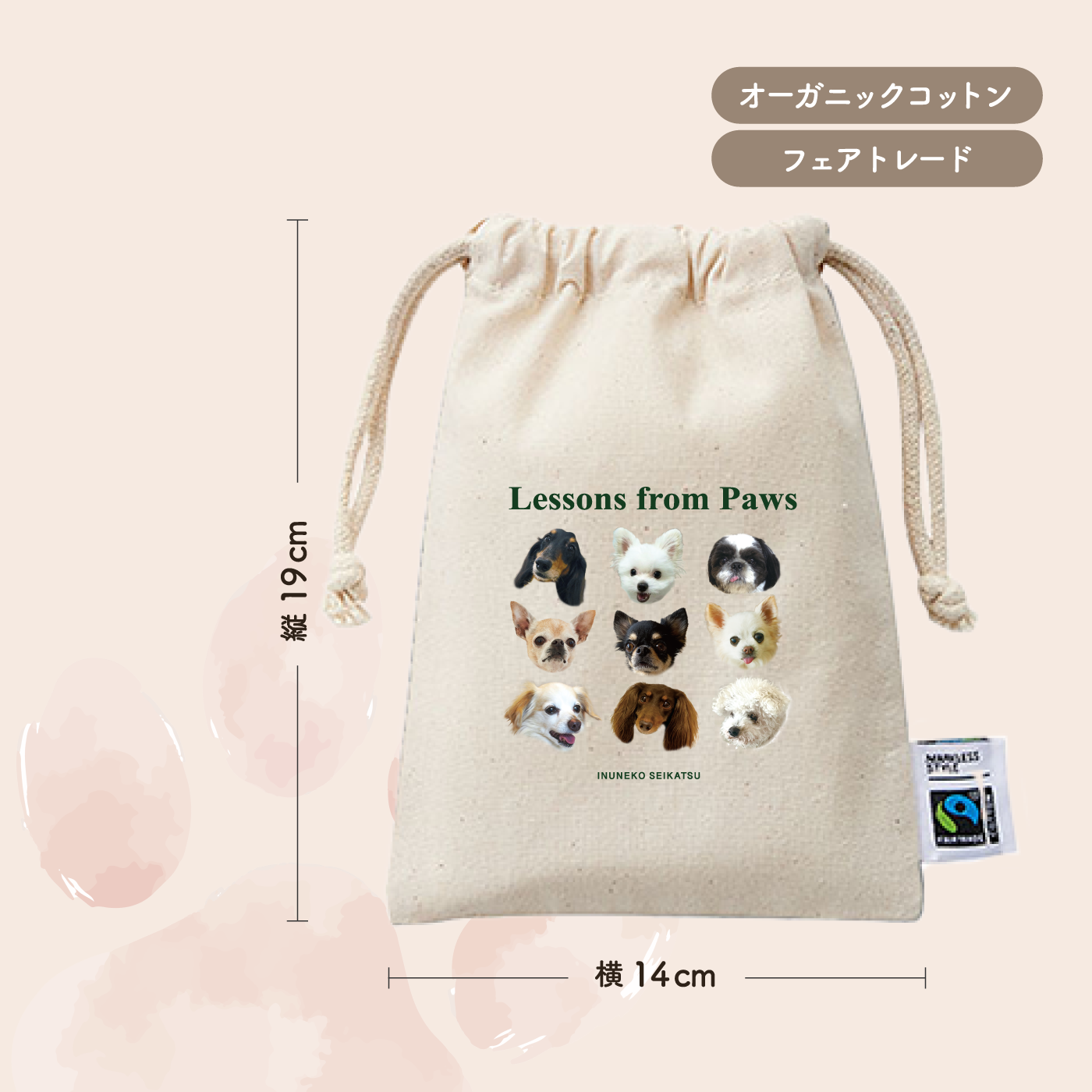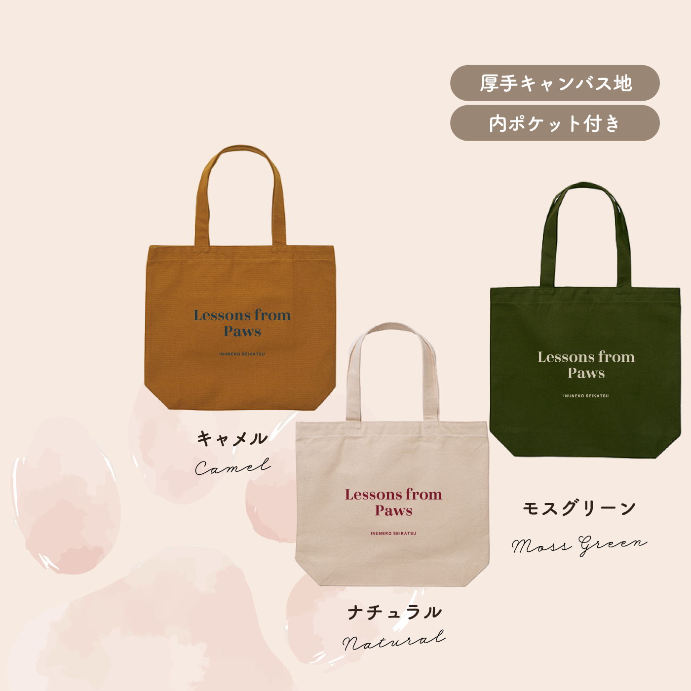 Lessons from Pawsというメッセージがシンプルにあしらわれたデイリーに使いたいコットンバッグ。