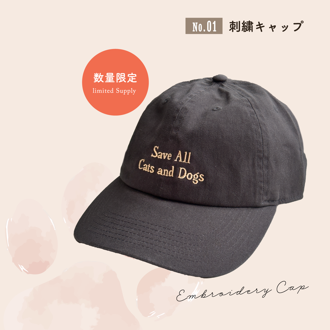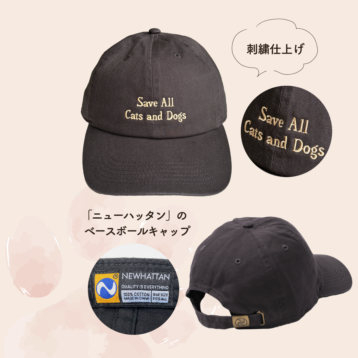 「Save All Cats and Dogs」が刺繍であしらわれたフリーサイズのキャップです。