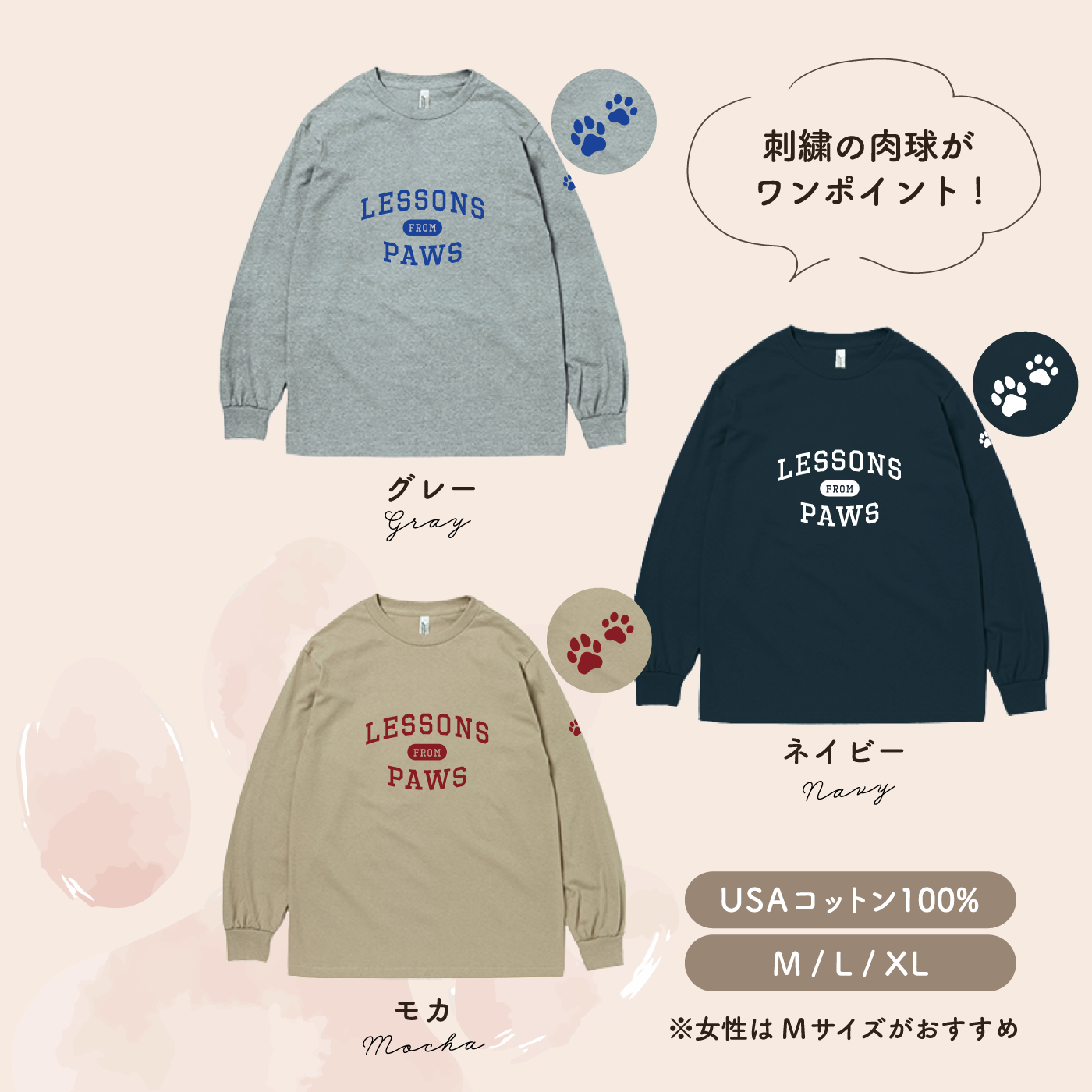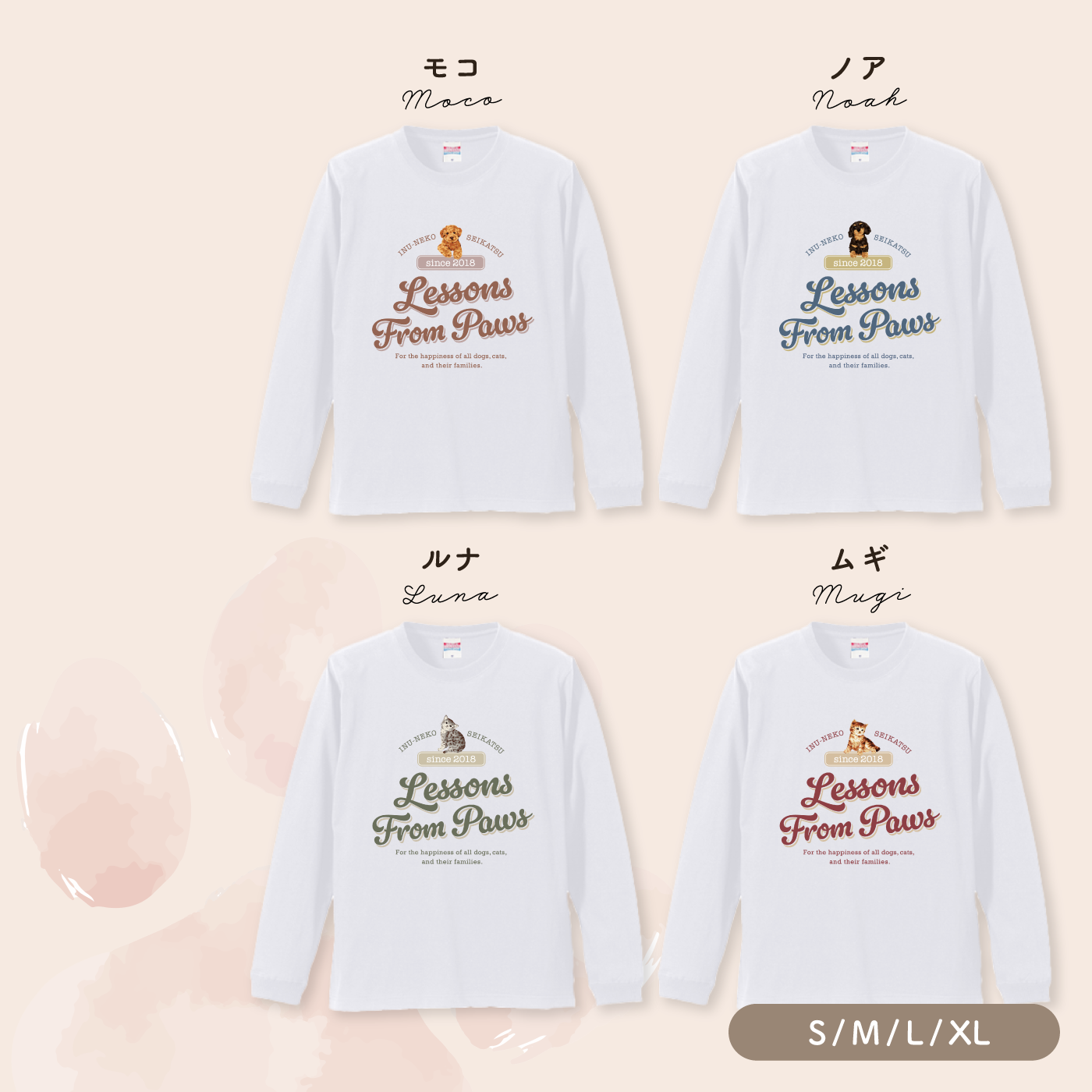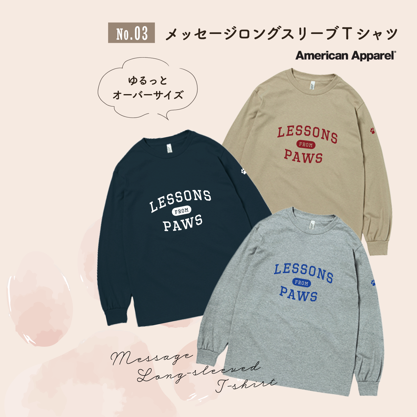 “Lessons From Paws”のメッセージとともに、日常にやさしい気持ちを届ける、秋冬にぴったりのロングスリーブTシャツです。