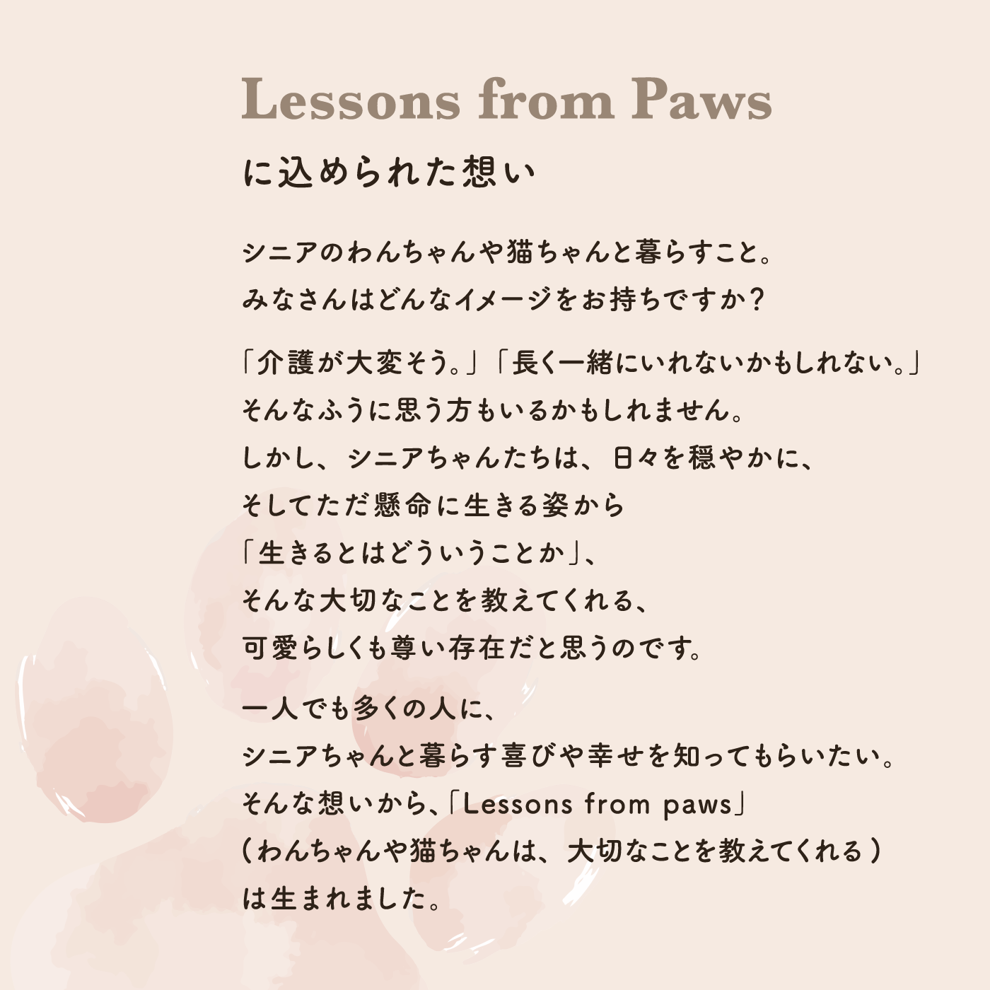 そんな想いから、「Lessons from paws(わんちゃんや猫ちゃんは、大切なことを教えてくれる)」は生まれました。