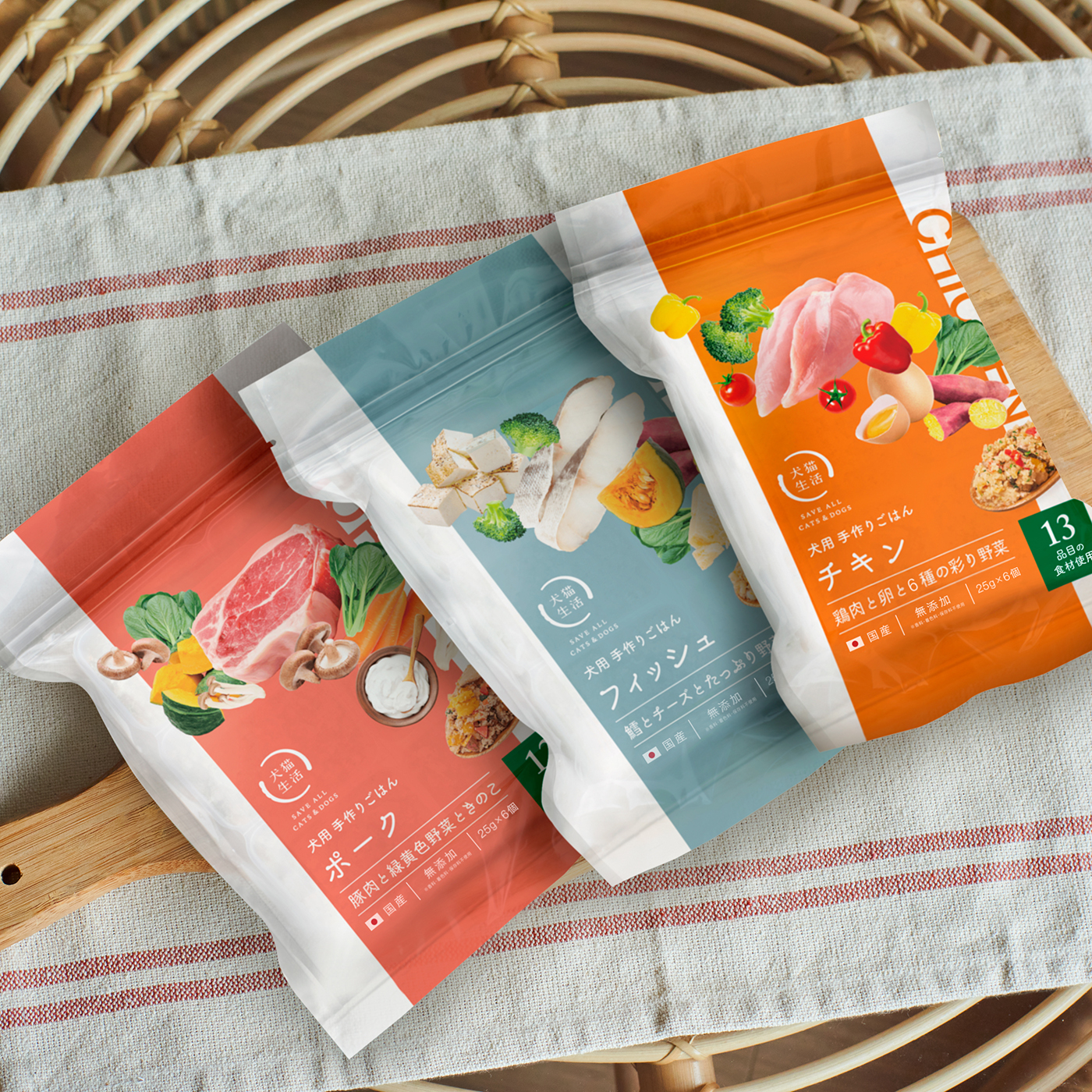 犬の料理研究家と獣医師と共同開発した国産無添加※・グレインフリーの手作りごはんです。総合栄養食でありながら、おいしさもとことん追求。全国から取り寄せた10種類以上のお肉やお野菜を独自レシピで丁寧に調理し、瞬間冷凍で素材そのもののおいしさを閉じ込めました。小分けパックで簡単に切り離せ、メインのごはんとしてもトッピングとしてもお手軽にお使いいただけます。チキン・ポーク・フィッシュをベースとした3種のお味をお楽しみください。※保存料、香料、着色料不使用